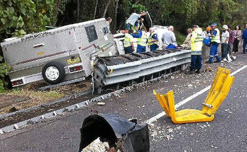 A 4WD towing a caravan crashed on the side of the Pacific Motorway at Chinderah yesterday afternoon.