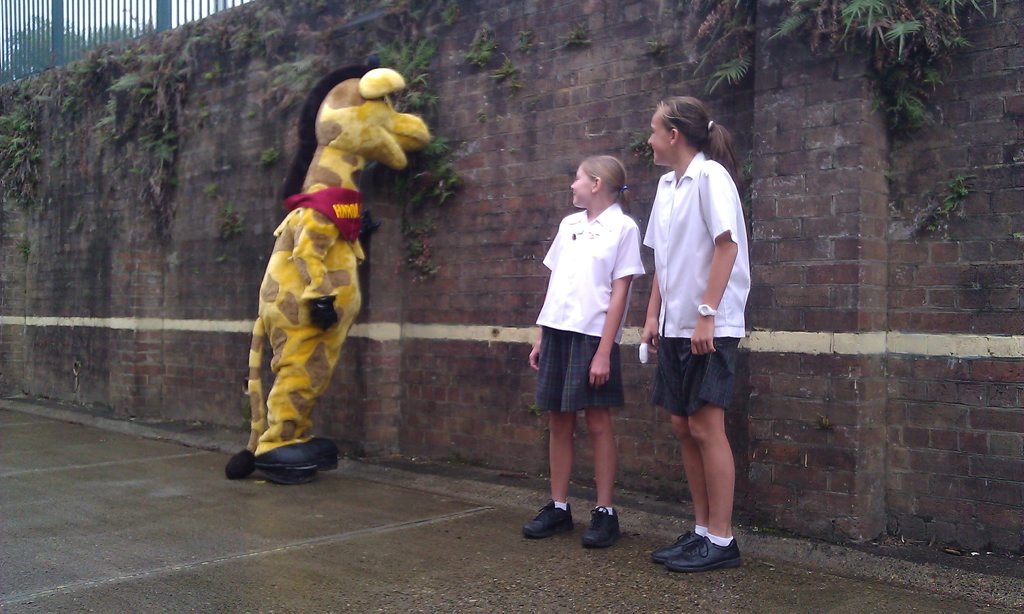 LIFE Education giraffe Healthy Harold made one of only two visits to Tweed Shire schools this morning.