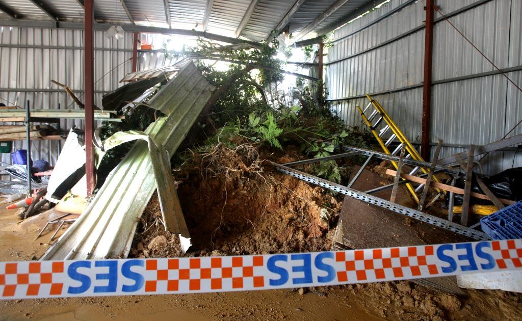 Trees, soil and stones swiftly slipped down the face and cascaded into the rear wall of the vehicle garage behind the main building, smashing through the Colorbond construction as though it was confetti.