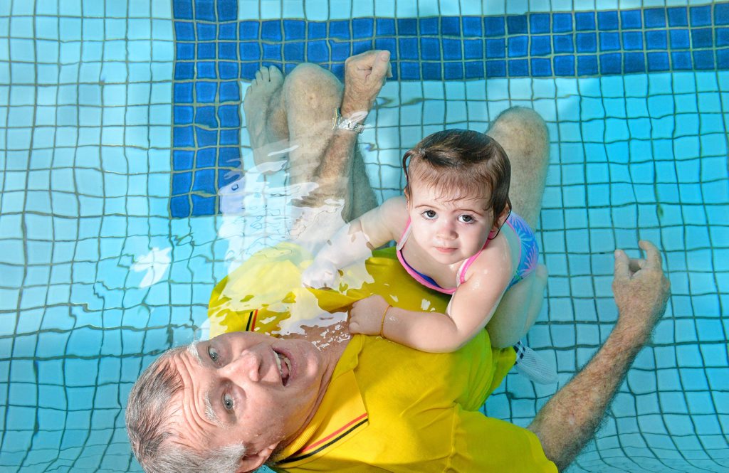 "It is education that saves lives and starting kids off as early as possible in the bath when they get home from hospital," Mr Lawrence said, as he swam with his baby granddaughter Harper Reid.