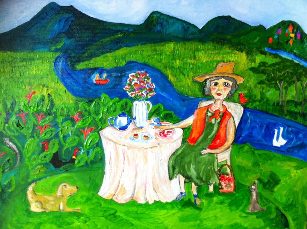 MARGARET Olley having a cuppa on the banks of the Tweed River with a little red bird perched on her chair.