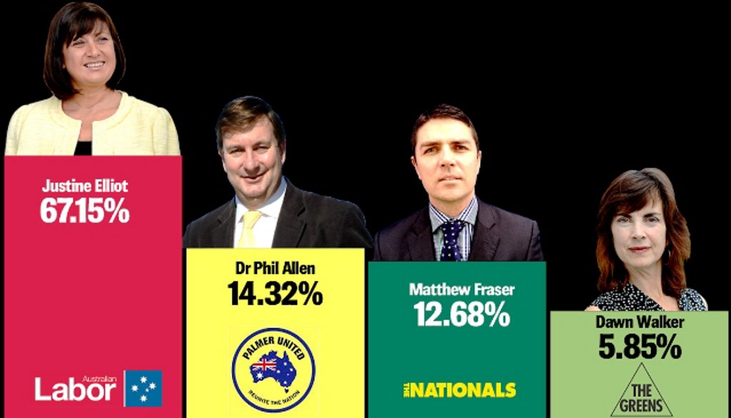 Dr Phil Allen, who is standing for Palmer United Party, gained 14% or 176 votes. Dr Allen said he was pleasantly surprised considering the party had only been launched a few weeks ago.