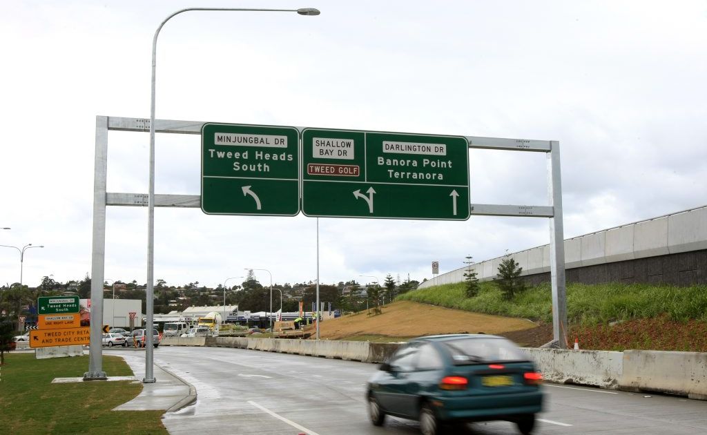 Options include heading towards Minjungbal Dr (Tweed Heads South), Shallow Bay Dr (Tweed golf) in the middle or Darlington Dr (Banora Point and Terranora) on the right.
