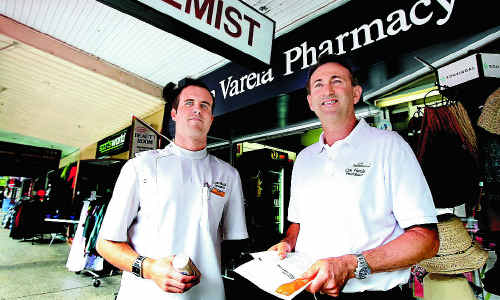 A MURWILLUMBAH chemist and his staff found themselves in the role of white knights yesterday when they intervened in a stabbing in the town's main street, rescuing the victim and restraining the alleged attacker.