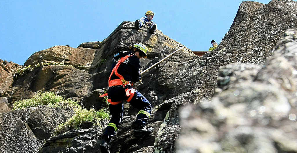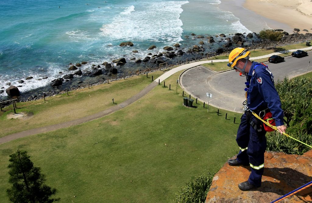 TWEED Heads firefighters dangled over Point Danger yesterday as part of a training exercise to upgrade their rescue capabilities.
