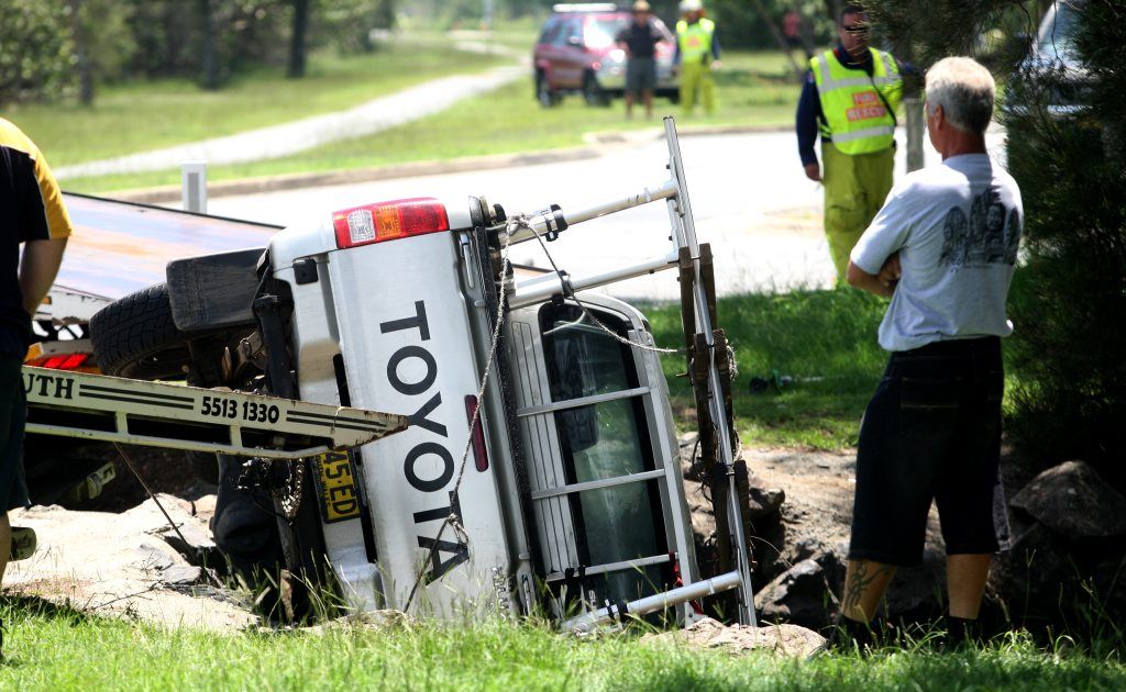 FINGAL Road, Fingal Head was blocked to traffic at noon on Sunday while the fire brigade and a tow truck hauled a grey Toyota 4WD ute from the Wommin Lake Creek.